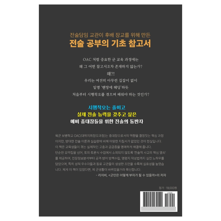 시행착오를 줄이고 야전에서 즉각 활용 가능한 실력을 갖추고 싶은 예비 중대장들에게 이 책은 든든한 전술적 동반자가 되어줄 것입니다."