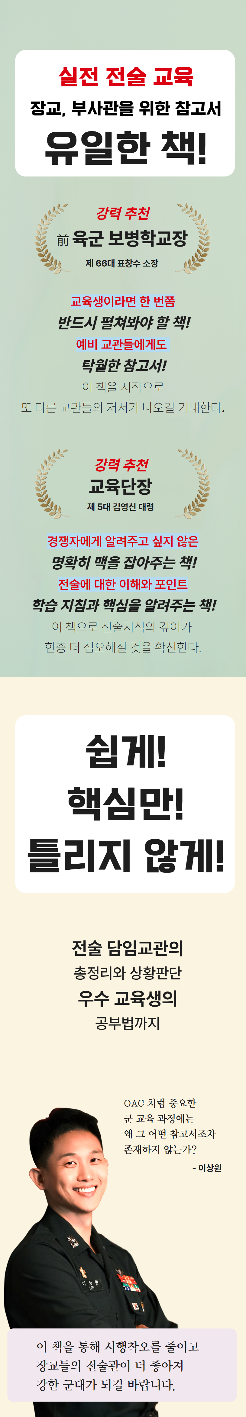 육군 보병학교 OAC(대위지휘참모과정)는 중대장으로서의 역량을 결정짓는 핵심 과정이지만, 방대한 전술 이론과 실습량에 비해 마땅한 지침서가 없었던 것이 현실입니다.